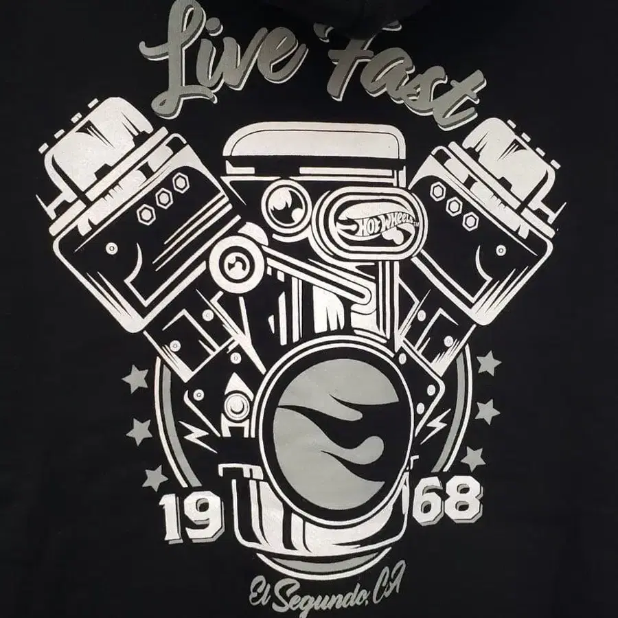 엔진 디자인과 슬로건이 특징인 핫휠 콜라보 후드티. - 디자인: 엔진 그래픽 프린트 - 연도: 1968 - 슬로건: Live Fast - 콜라보레이션: 핫휠 - 브랜드: 돈키 방문해 주셔서 감사합니다.