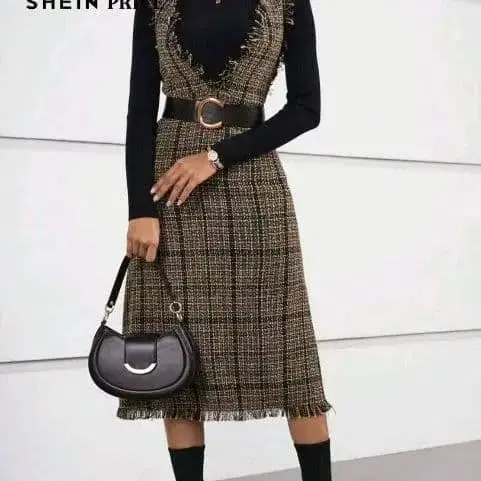 체크 무늬의 프린지 디자인이 특징인 슬리브리스 미니 원피스. ※ 벨트는 부속되지 않습니다.