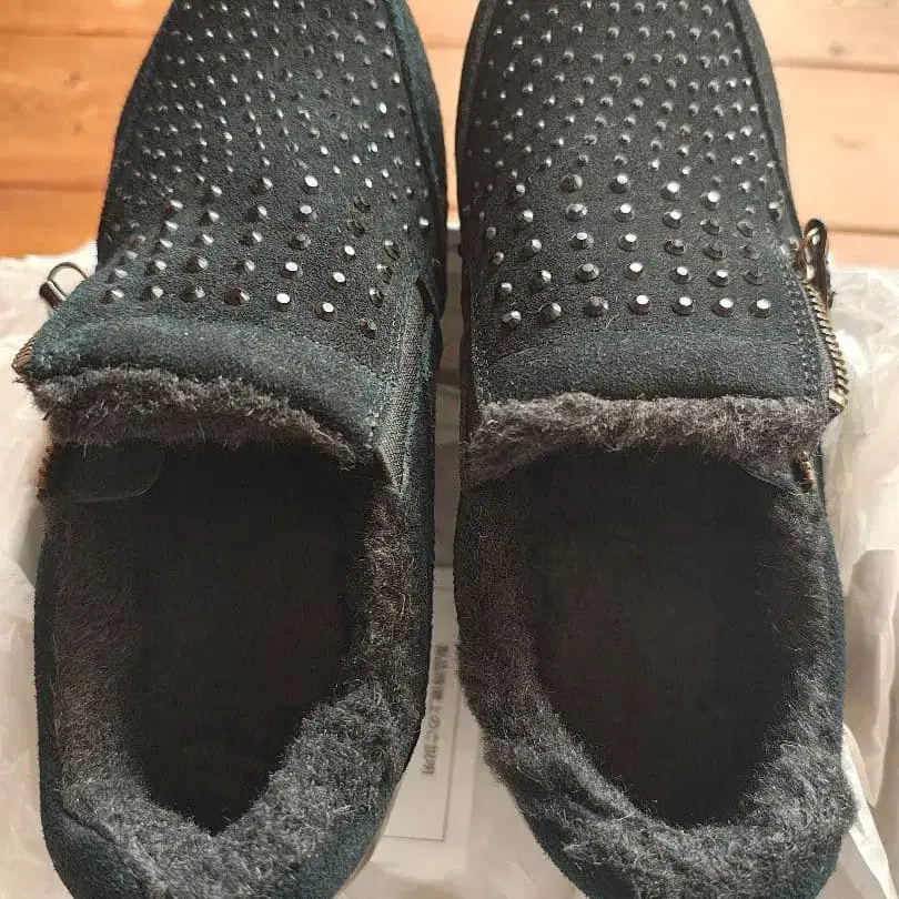 구매했지만, 미사용 상태로 어두운 곳에 보관했습니다. 상태는 좋다고 생각합니다. 스터드가 달린 블랙 스웨이드 슬립온, 퍼 안감으로 쾌적한 착용감. - 색상: 블랙 - 디자인: 스터드 장식 - 소재: 스웨이드 - 스타일: 슬립온 - 굽 높이: 약 5cm - 안감: 퍼 안감 방문해 주셔서 감사합니다. 사이즈 - 23cm