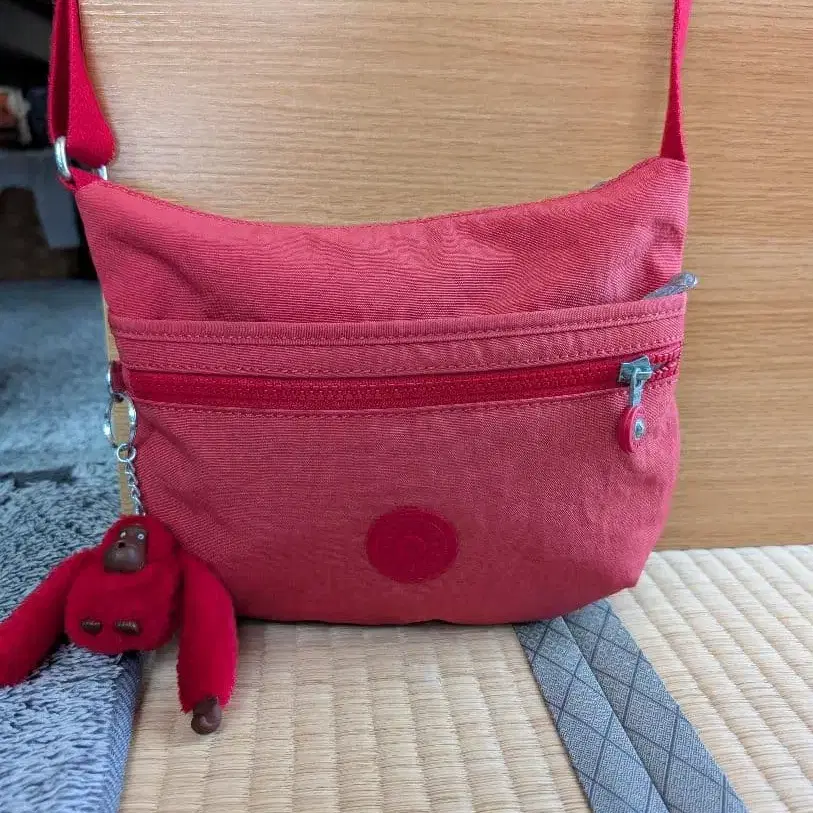 심플한 빨간색 숄더백, 외부 포켓과 원숭이 키링 부착.