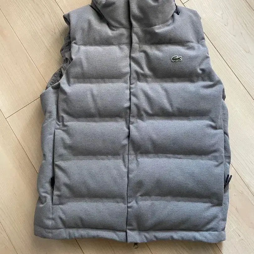 그레이 색상의 Lacoste 다운 베스트, 지퍼 포켓이 있어 스타일리시합니다.