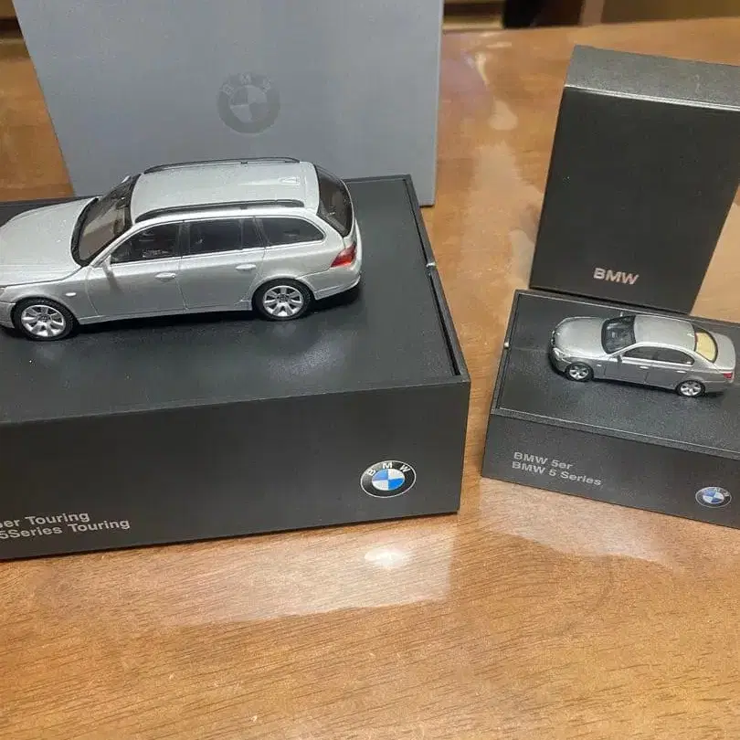 BMW X5 Touring 및 5 시리즈 미니카 세트, 실버 마감, 오리지널 박스 포함.