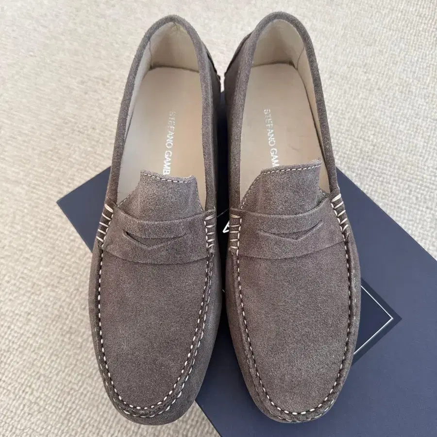 엘리펀트 컬러의 벨로아 소재로, 러버 솔을 채용한 39 사이즈 로퍼.