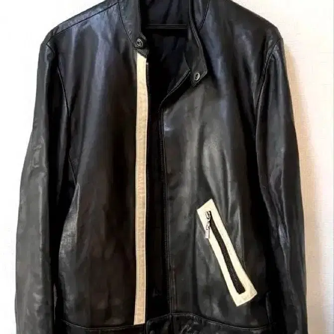 스타일리시한 싱글 라이더 자켓, 블랙 가죽 소재로 사이드 포켓이 있습니다.