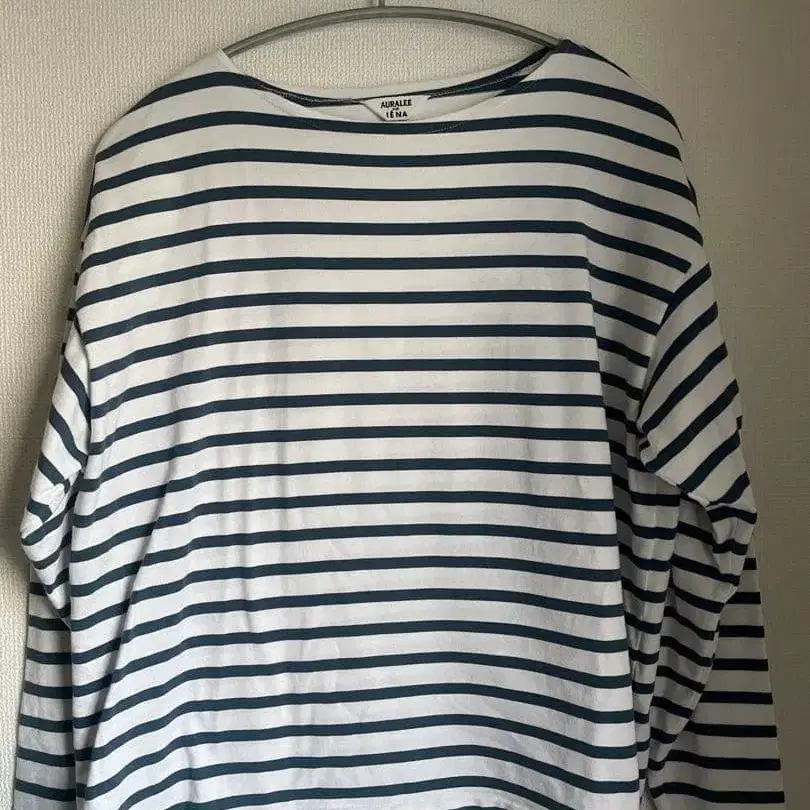 자동 번역되었어요. 원문보기화이트와 네이비 스트라이프 디자인의 긴팔 티셔츠.