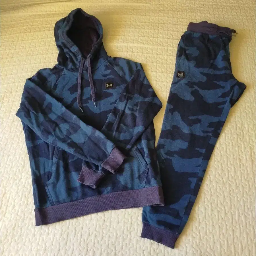 중고 카모 패턴 후드 부착 맨투맨과 팬츠 세트.