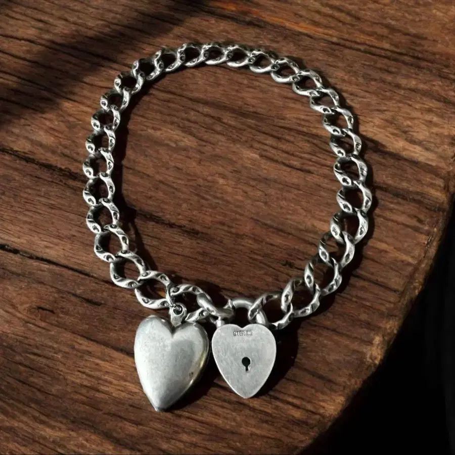 자물쇠 모티브와 심플한 하트 모티브가 달려 있습니다. 팔찌 부분은 독특한 무늬 디자인이 새겨진 빈티지한 멋이 있는 상품입니다.