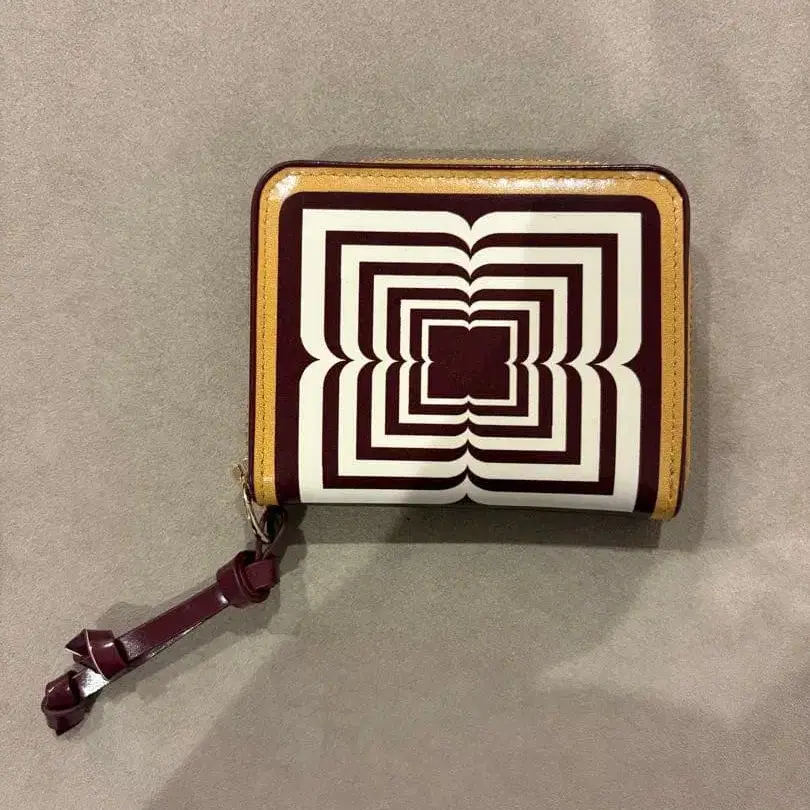 기하학 패턴의 보르도와 베이지 색상 가죽 접이식 지갑, 카드 슬롯 포함.