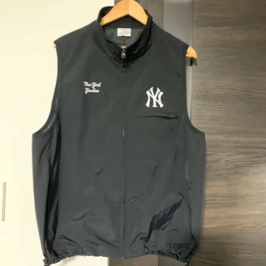 뉴욕 양키스의 로고가 자수로 새겨진 블랙 나일론 지퍼 베스트.