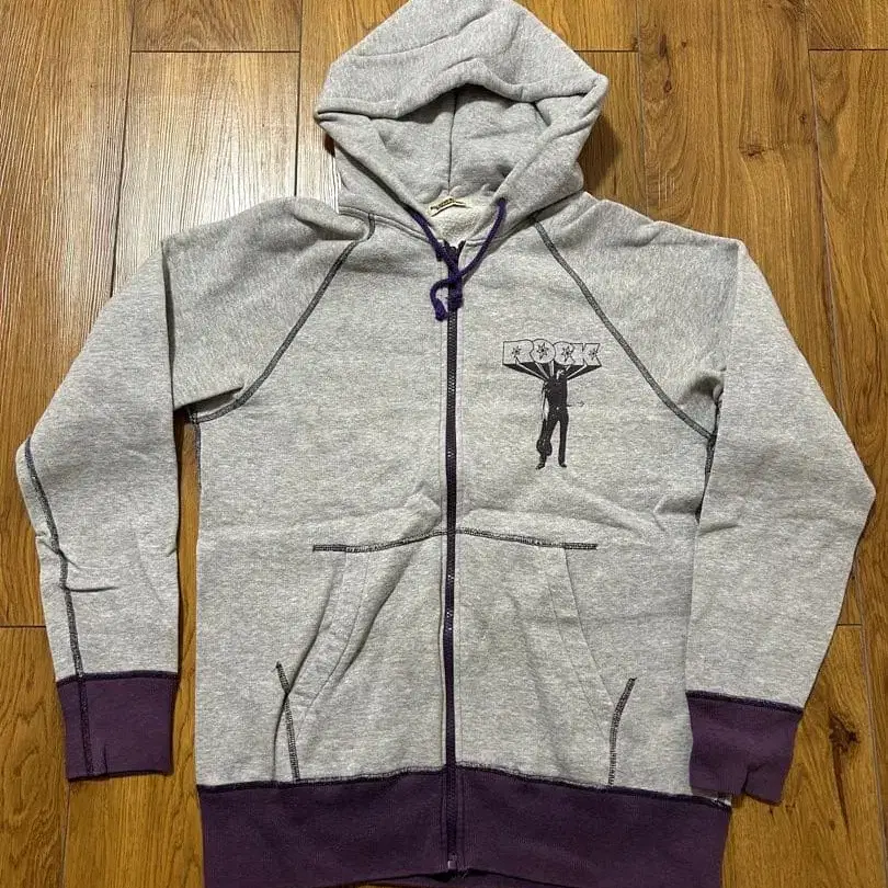 그레이와 퍼플 색상의 풀 집업 후드티, 락 프린트가 특징입니다.