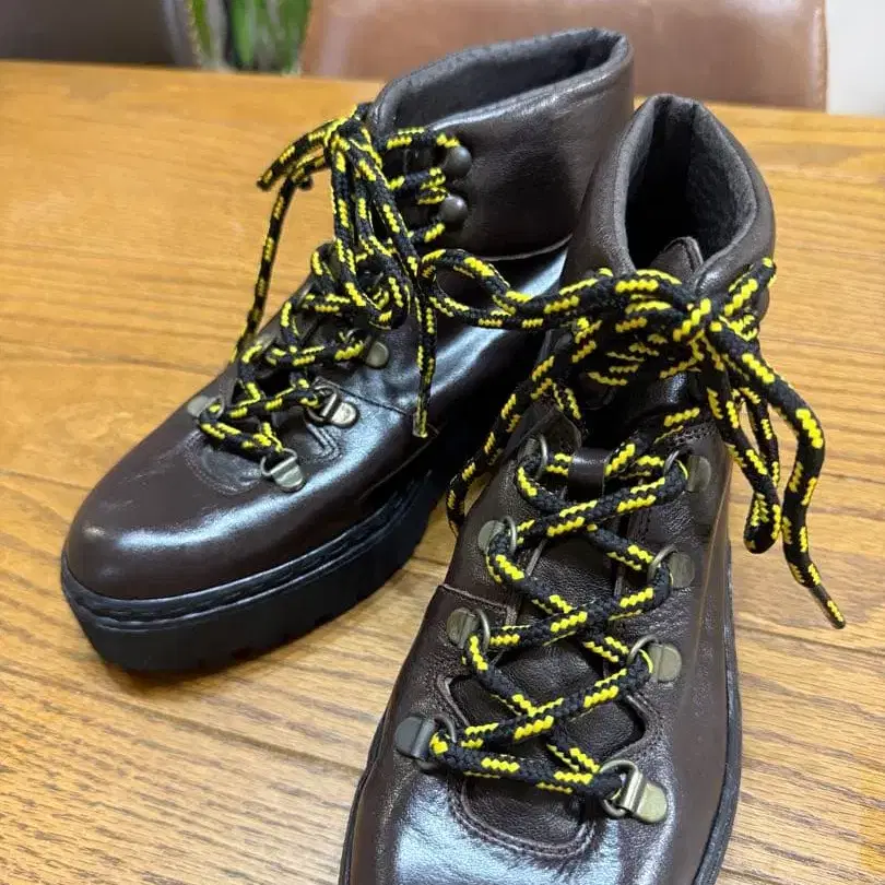 스페인산 레메의 브라운 가죽 하이컷 워크 부츠, 블랙과 옐로우 컬러 스트라이프 신발끈 포함. - 색상: 브라운 - 신발끈 색상: 블랙과 옐로우 컬러 스트라이프 - 밑창 디자인: 트레드 패턴 포함 - 스타일: 하이컷 - 소재: 가죽 방문해 주셔서 감사합니다.
