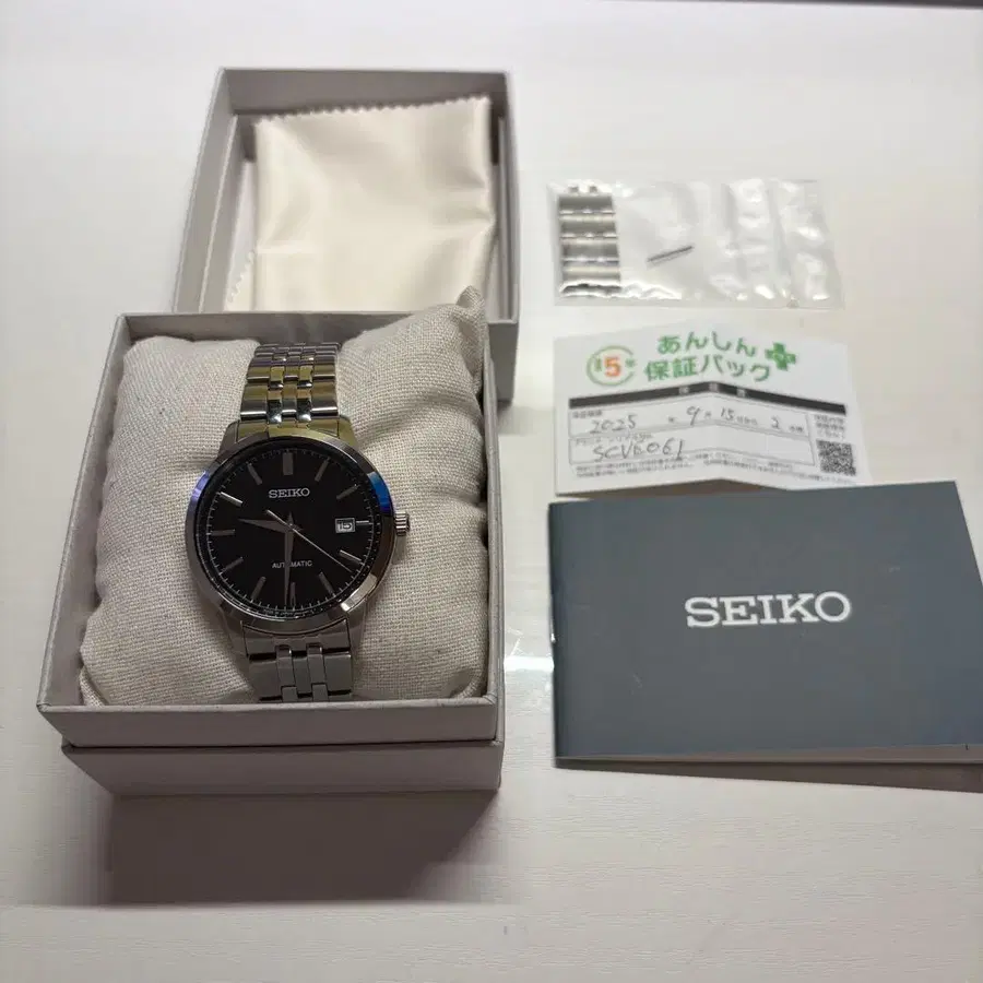 블랙 다이얼의 자동 와인딩 시계, 스테인리스 스틸 소재의 팔찌 포함.