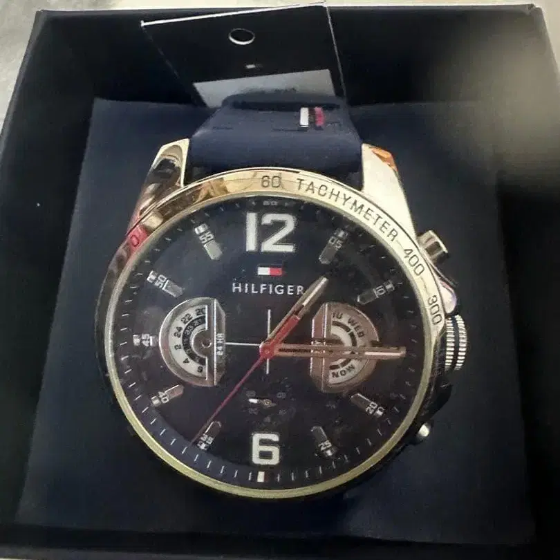 네이비 색상의 고무 벨트와 스테인리스 스틸 소재의 TOMMY HILFIGER 시계.