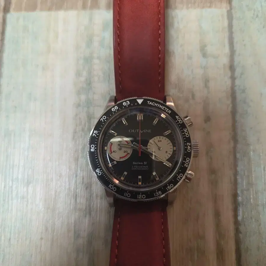 블랙과 빨간색의 크로노그래프 디자인에 태키미터 기능이 있는 손목시계입니다.