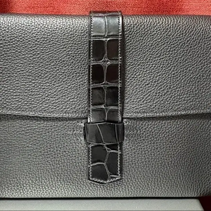 크로커다일이 특징인 메종 타쿠야(MAISON TAKUYA)의 블랙 컬러 가죽 클러치백.