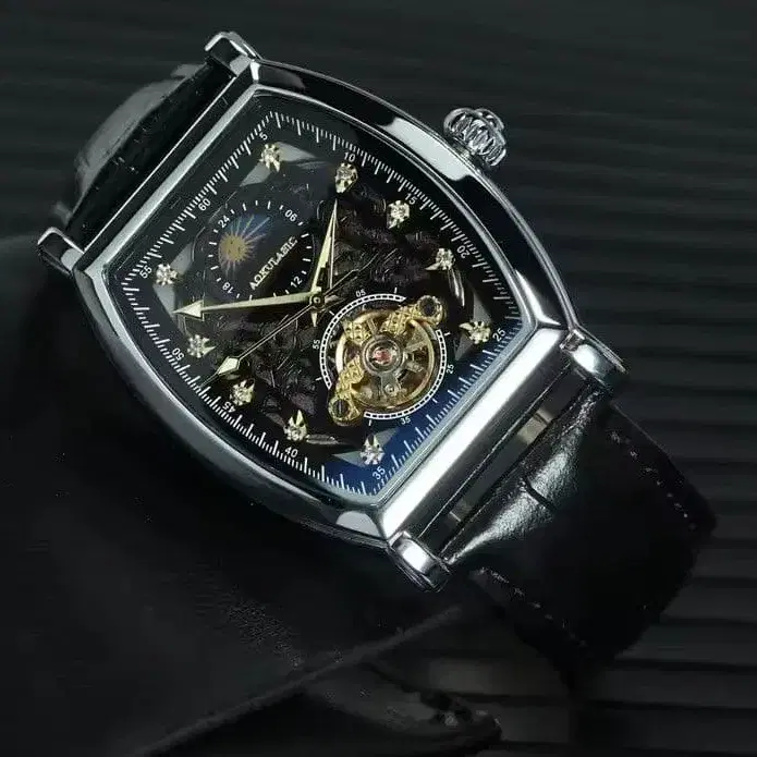 스켈레톤 디자인의 자동 시계, 월령 표시 포함. - 모델: 자동 시계 - 색상: 블랙/골드 - 소재: 가죽 (밴드) - 모양: 직사각형 - 특징: 스켈레톤 다이얼 - 기능: 월령 표시 방문해 주셔서 감사합니다.
