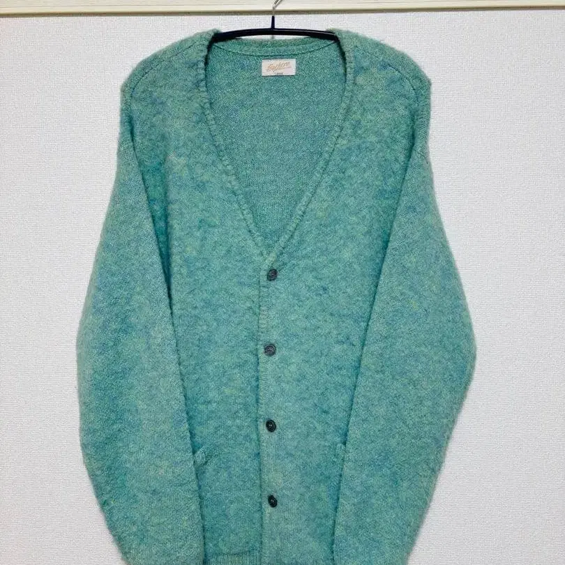 민트 그린 색상의 버튼이 달린 니트 가디건, L 사이즈, 포켓이 있어 실용적입니다.
