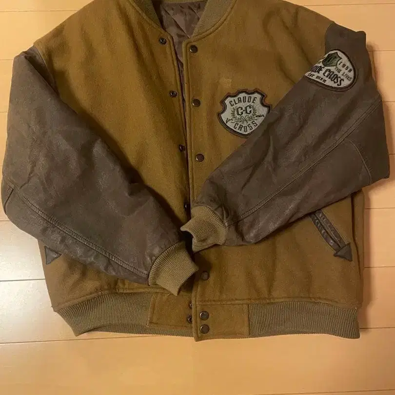 브라운 색상의 바시티 자켓, CLAUDE CROSS 디자인.