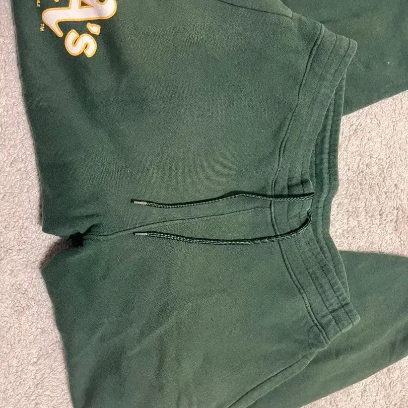 A의 로고가 특징인 다크 그린 색상의 스웨트 팬츠입니다.