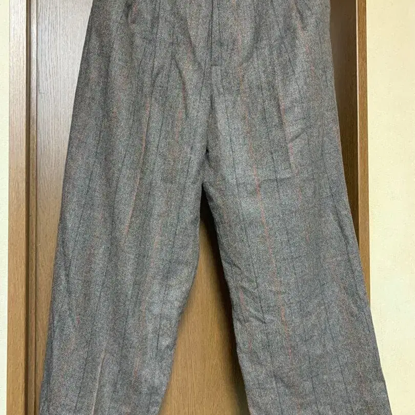 헤링본 무늬의 브라운 계열 와이드 팬츠, 프론트 버튼이 있고 백 포켓이 있습니다.