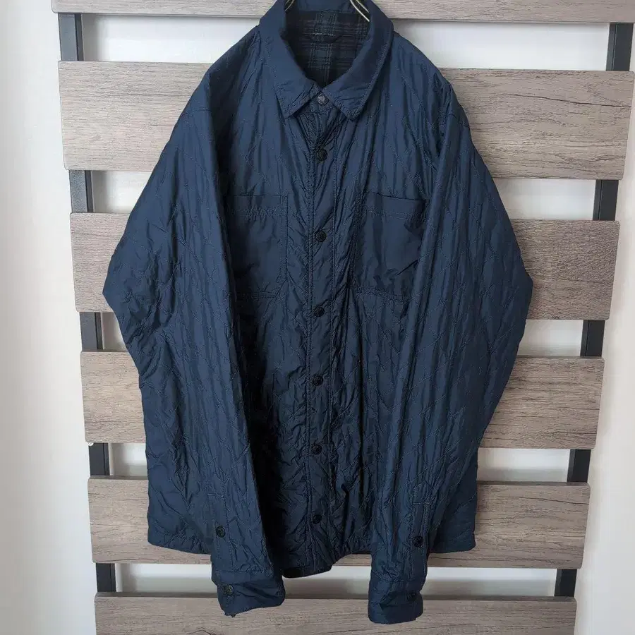 네이비 색상의 퀼팅 자켓입니다. 프론트 버튼과 포켓이 있어 캐주얼한 스타일에 최적입니다.