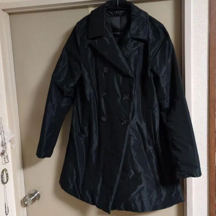 심플한 theory의 다운 코트입니다. 어떤 복장에도 잘 어울리고 코디하기 쉬운 디자인입니다. 더블 브레스트 디자인이라 포멀한 자리에서도 좋습니다.