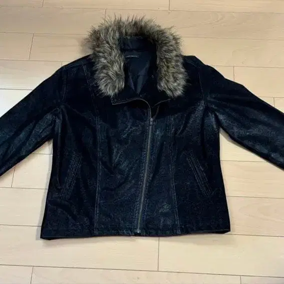 퍼가 달린 블랙 가죽 자켓으로, 스타일리시한 디자인이 특징입니다.