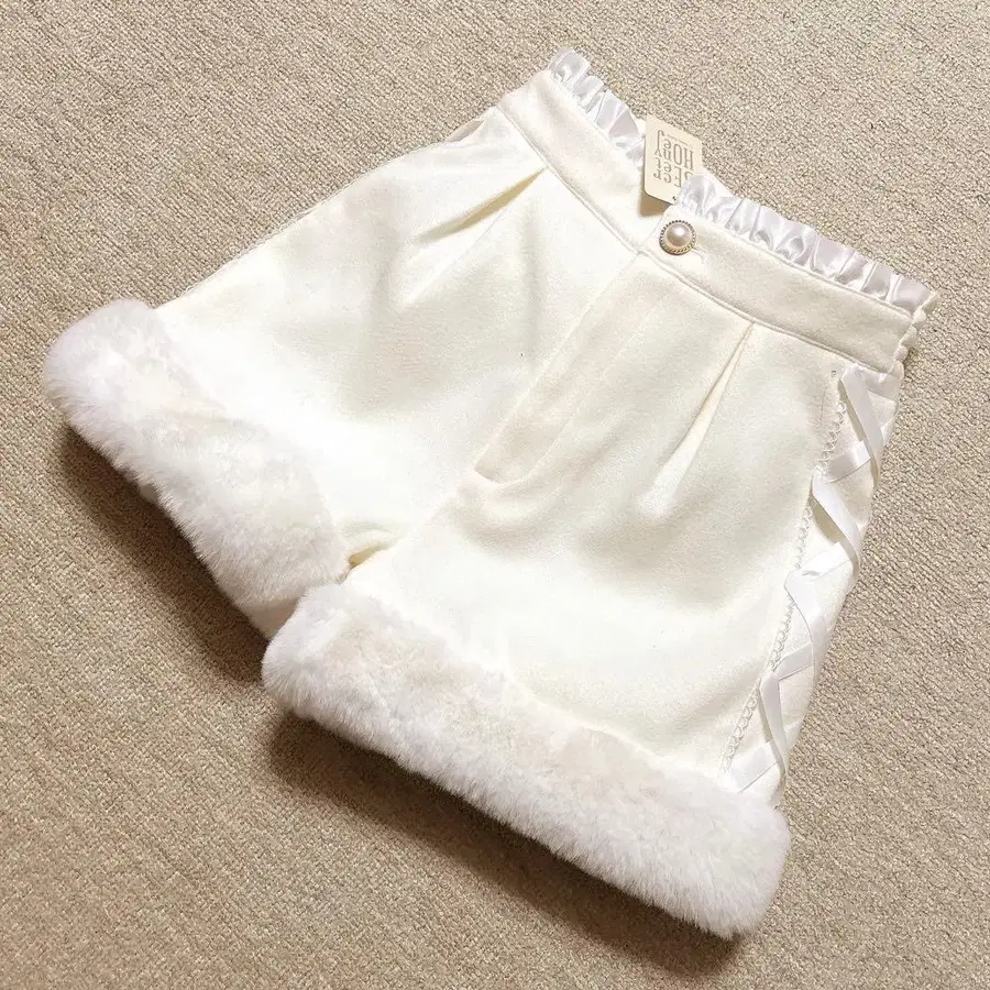 플리스 소재의 화이트 숏팬츠, 리본과 퍼가 달린 밑단이 특징입니다.