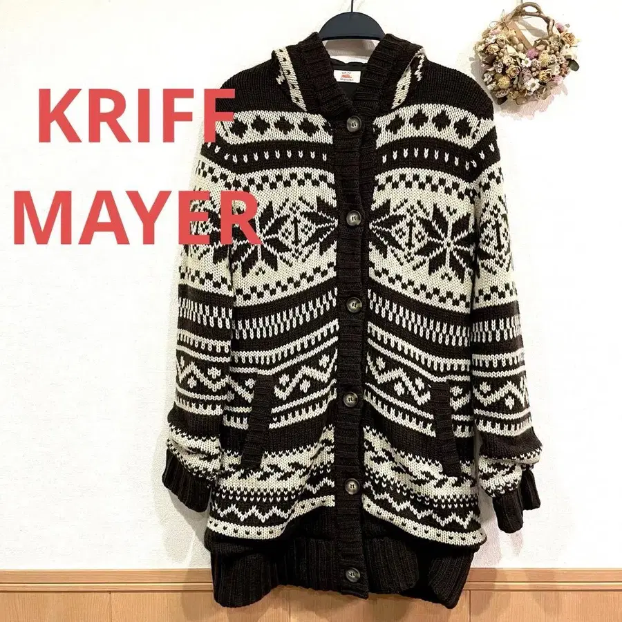 KRIFF MAYER의 코위찬 가디건입니다. 심플한 눈꽃 무늬입니다. 어느 정도 사용감이 있지만 아직 착용 가능하다고 생각합니다. 아주 귀여워요. 안감이 소매까지 있어서 매우 따뜻합니다. 좌우 포켓 있습니다. 밑단과 소매의 니트 부분에 늘어짐이 있습니다. 가슴 너비 약 45cm 기장 약 87cm 화장 약 83cm 소재 겉 아크릴 85% 모 15% 안 폴리에스테르 100%
