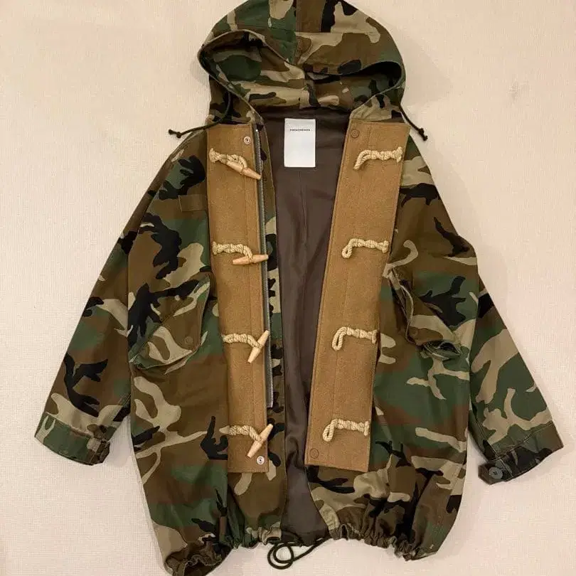 밀리터리 코트의 전면부에 더플 버튼이 도킹되어 있습니다.