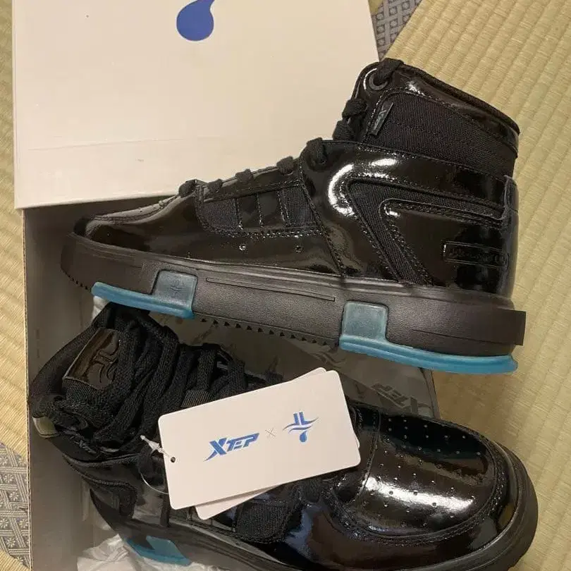 광택이 나는 블랙 어퍼와 블루 밑창의 하이컷 스니커즈.
