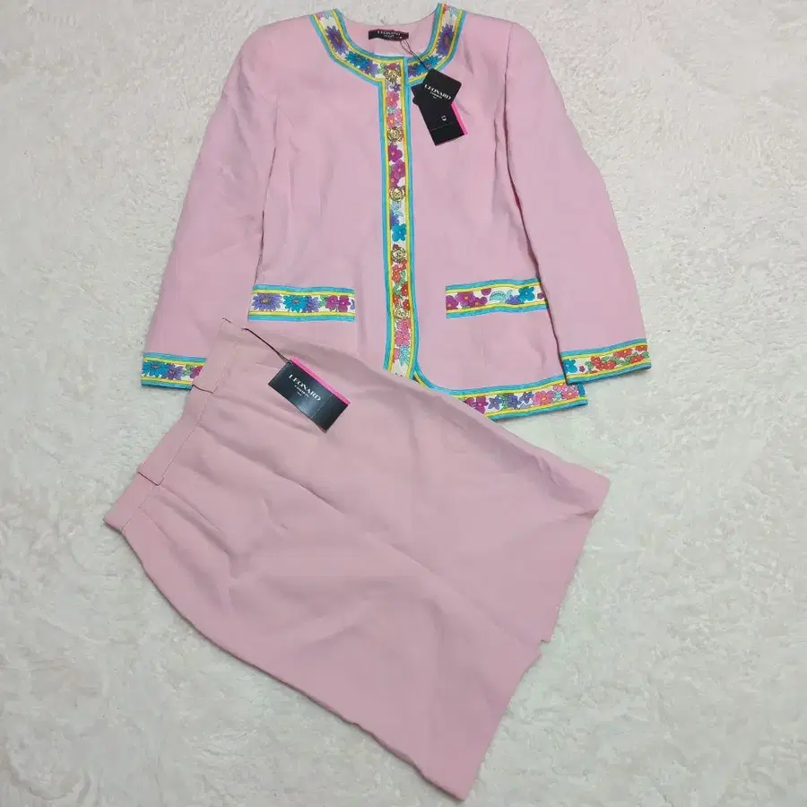 [ 미사용품 ] LEONARD 핑크 셋업 9AR 실크 100% 골드 버튼
