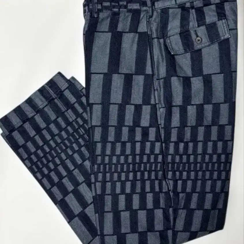 특징: 1980년대 컴퓨터 및 콘솔 게임, 테크노 뮤직에서 영감을 받은, 규칙적이고 무기적인 아트 워크 (기하학 패턴)를 자카드 직조로 표현한 오리지널 트라우저 (팬츠)입니다.