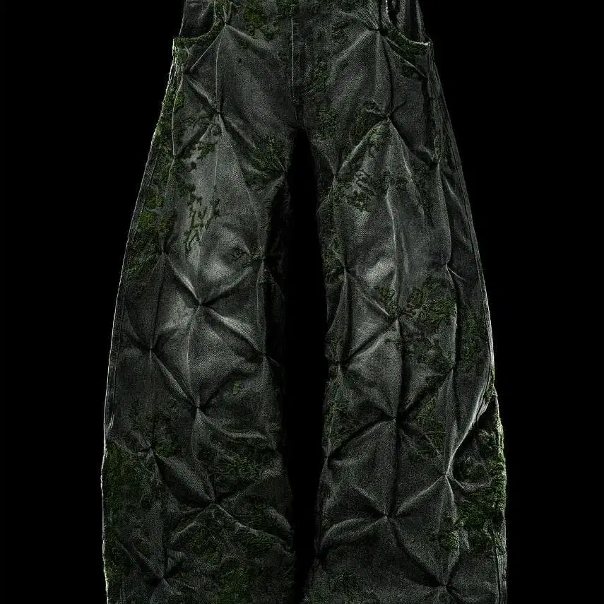 MOSS 'OVERGROWTH' DENIM - 미드 웨이트 올리브 데님을 사용하고, 35만 스티치를 넘는 컷 체인 스티치를 그린 색상의 실 3본으로 시공했습니다. 이끼가 유기적으로 퍼져 원단을 파고드는 모습을 표현했습니다. 익숙한 다트 무늬가, 자수가 팬츠의 구조를 뒤덮듯이 형태를 돋보이게 합니다. 각각의 팬츠가, 우거진 생태계의 일부가 되어, 자연이 남겨진 것을 뒤덮는 듯한 감각을 체현하고 있습니다.