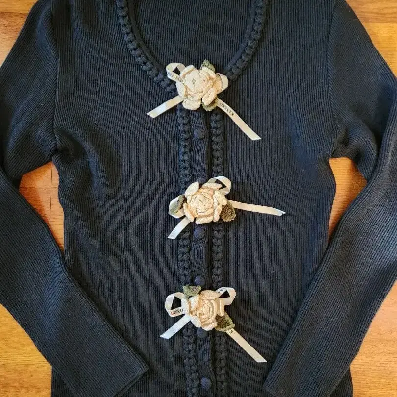 꽃 모티브를 사용한 귀여운 코튼 니트 가디건입니다.