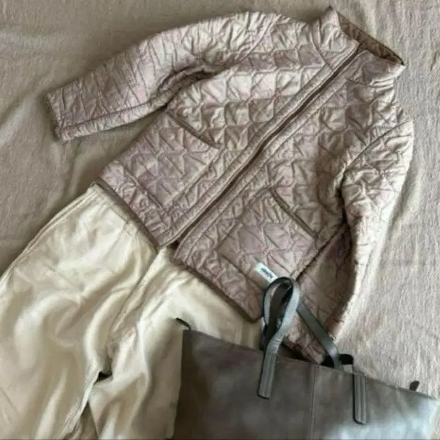 베이지 색상의 퀼팅 자켓으로, 프론트 포켓이 있어 실용적입니다.