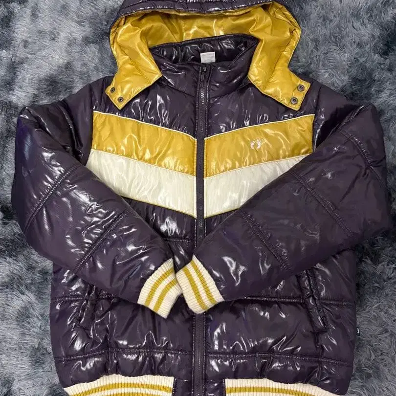 광택이 나는 보라색 후드 부착 다운 자켓, 스트라이프 디자인과 발자국 자수 포함. - 색상: 보라색/금색/화이트 - 디자인: 후드 부착, 광택 마감, 스트라이프 디자인 - 로고: 발자국 자수 - 소재: 다운 자켓 - 특징: 뒷면에도 스트라이프 디자인 - 리브: 밑단과 소매에 스트라이프 리브 방문해 주셔서 감사합니다.