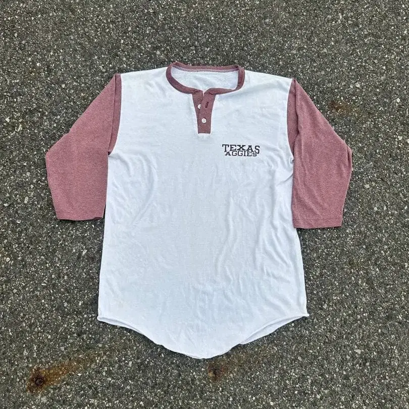 80년대 텍사스 로고 래글런 헨리넥 독특한 디자인과 벽돌색 컬러가 희귀한 일품입니다. 아메카지 스타일을 좋아하시는 분들께 추천합니다.