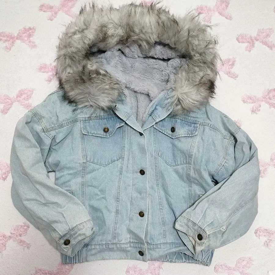 퍼가 달린 라이트 블루 데님 자켓, 플리스 안감으로 따뜻합니다.