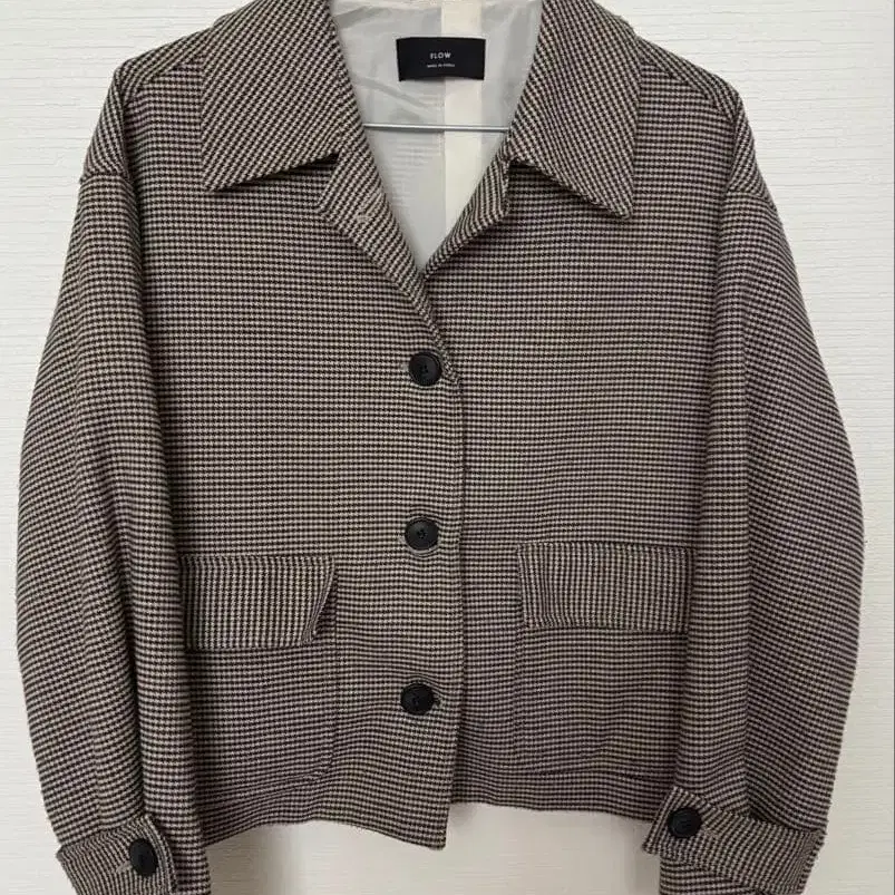 자동 번역되었어요. 원문보기하운드투스 패턴의 숏 자켓, 프론트 포켓 부착.