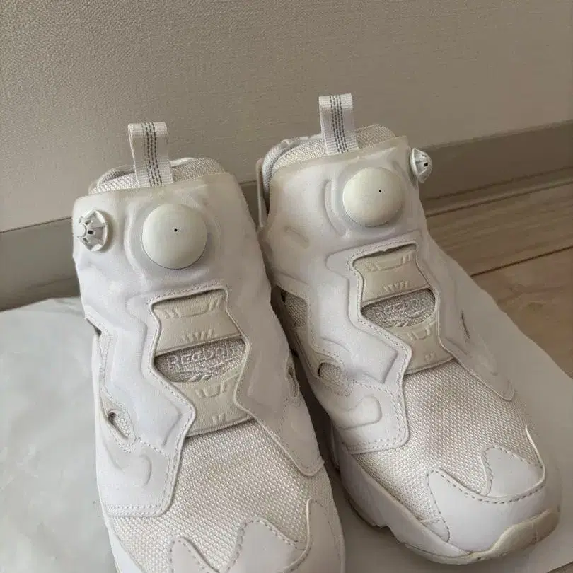 모델명 - 인스타펌프 퓨리 ABC마트에서 2만 엔 정도에 구매했던 것 같습니다. 상자는 없습니다. 밝은 곳에서 보면 약간의 황변이 있습니다. 2회 정도 착용했습니다.