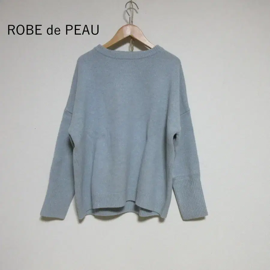 자동 번역되었어요. 원문보기라이트 블루 오버 사이즈 니트 스웨터, 부드러운 소재감이 특징.