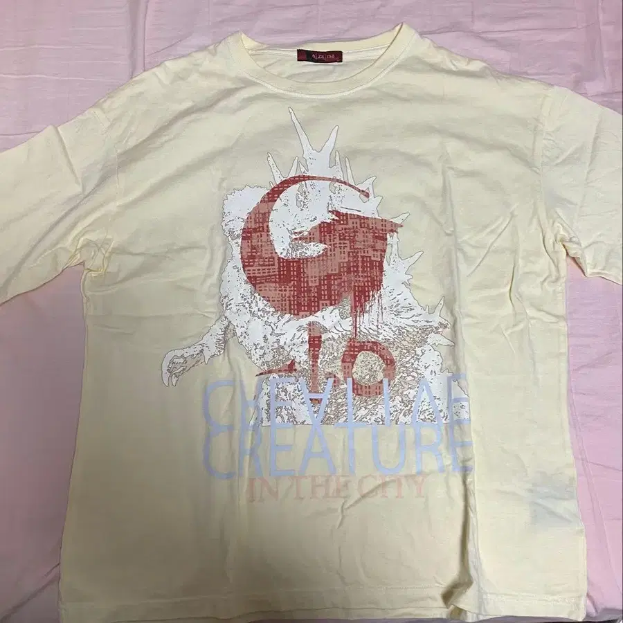 고질라 콜라보 T셔츠입니다. 전시회에서 구매했습니다. 색상은 아마 베이지였던 것 같은데 확신이 없습니다. 옅은 노란색, 크림색과 같은 색입니다.