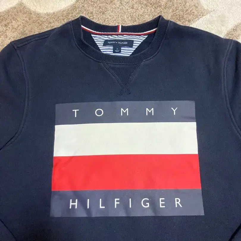 네이비 TOMMY HILFIGER 트레이닝복, M 사이즈, 로고 프린트 디자인.
