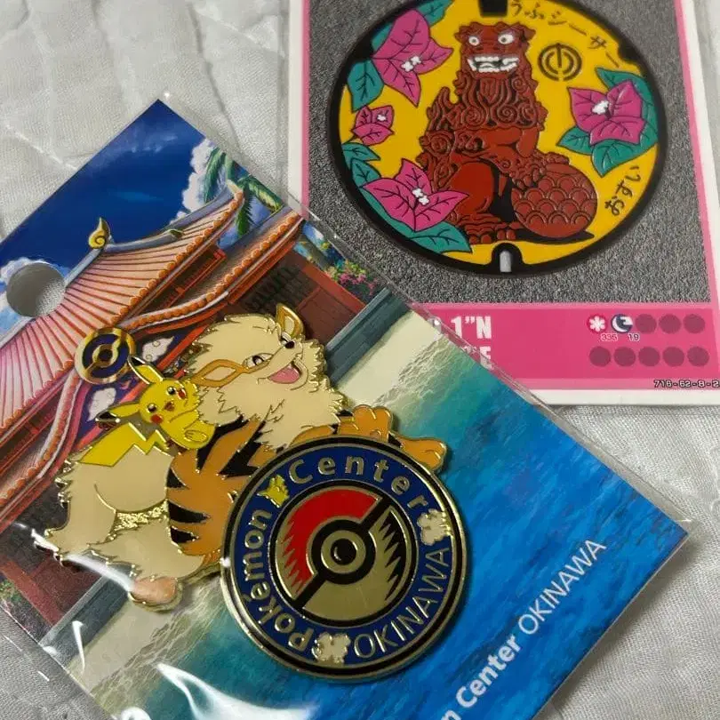 포켓몬 센터 오키나와 한정판 핀 배지입니다. 포켓몬 (피카츄, 윈디)이 그려져 있으며, [Pokémon Center OKINAWA] 문자가 새겨져 있습니다.