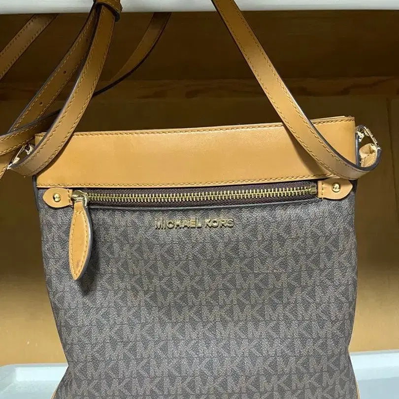 브라운과 베이지 색상의 MICHAEL KORS 숄더백입니다. 조정 가능한 스트랩과 다기능 포켓이 있습니다.