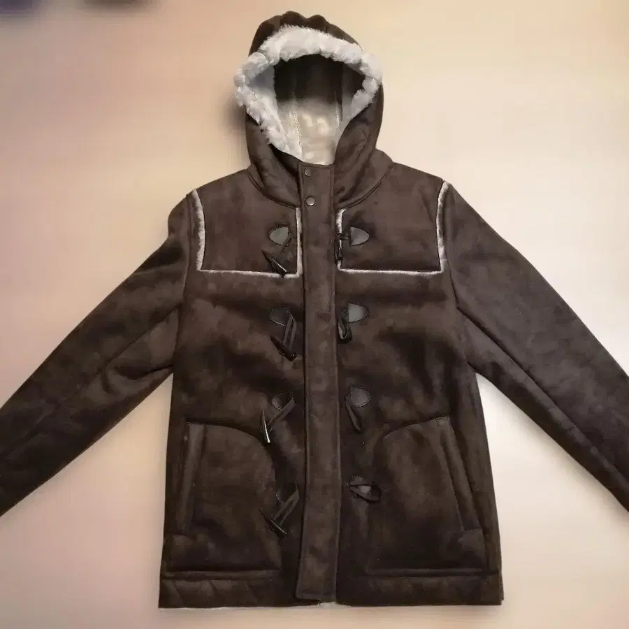 퍼가 달린 후드와 토글 버튼이 특징인 브라운 더플 코트.