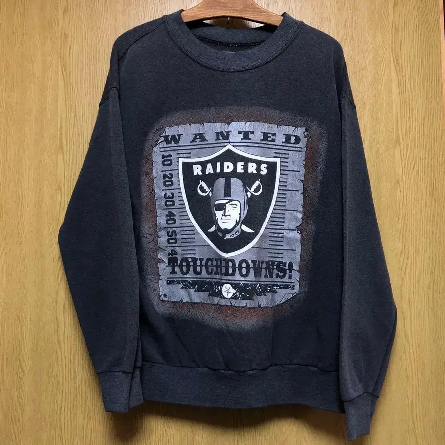 다크 그레이 색상의 Wanted Raiders Touchdowns! 디자인의 크루넥 트레이닝복.