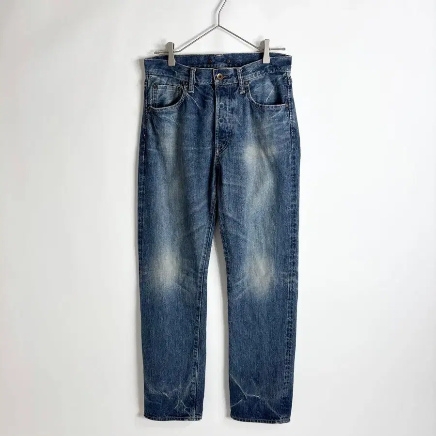 좋은 염매로 에이징 가공된 데님 팬츠.