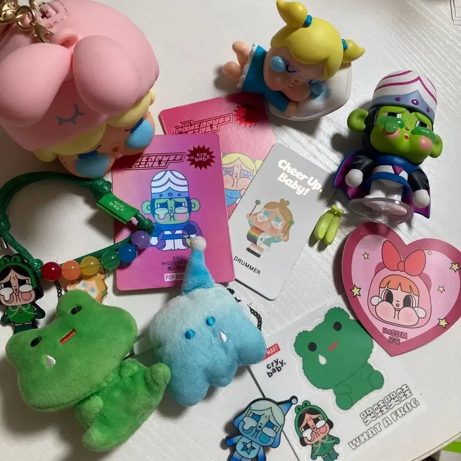 CRY BABY 팔찌 1개 again 스티커 1개 파워퍼프걸 스티커 1개 again 배지 2개 파워퍼프걸 피규어 2개 팝마트 크라이베이비 파자마 파티 이어폰 케이스 토끼 1개 카드 3장 모두 세트로 보내드립니다.